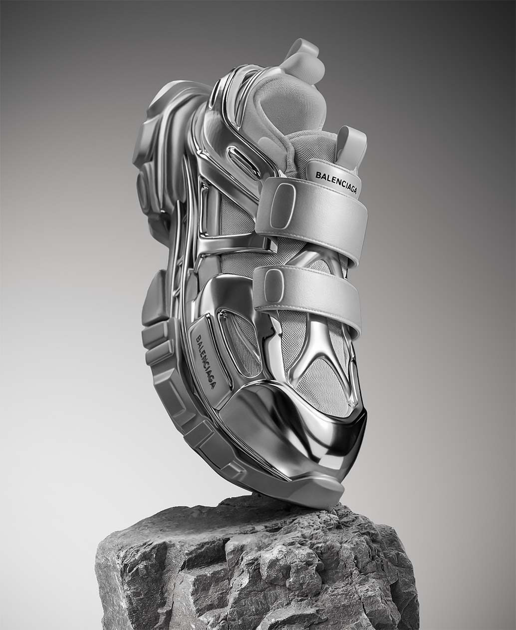 The design combines rigid chrome plates, textile underlayers and industrial clips, with no laces to emphasize structure and impact. The project was developed using 3D modeling and rendering, focusing on volumes, materials and contrast between chrome and black finishes.