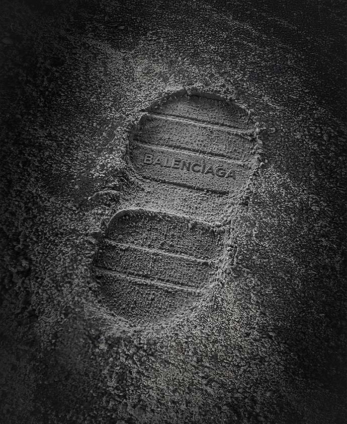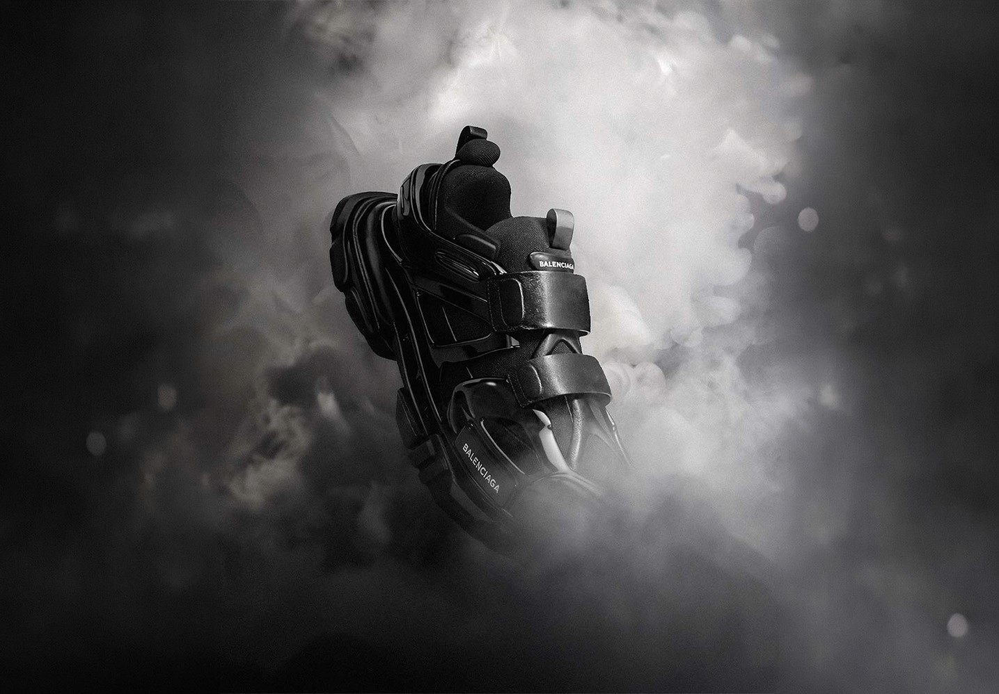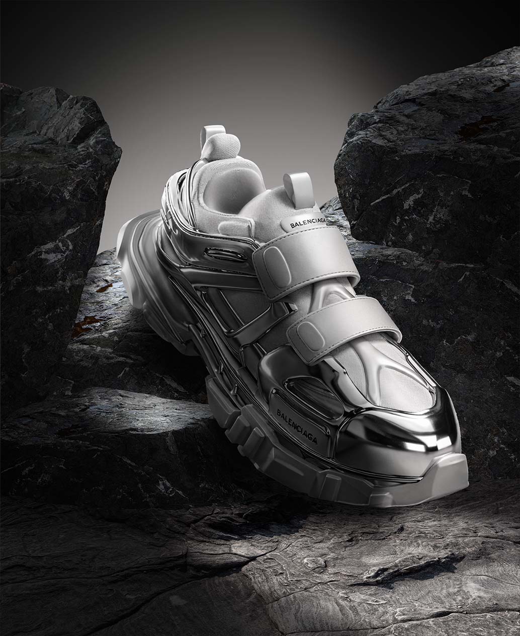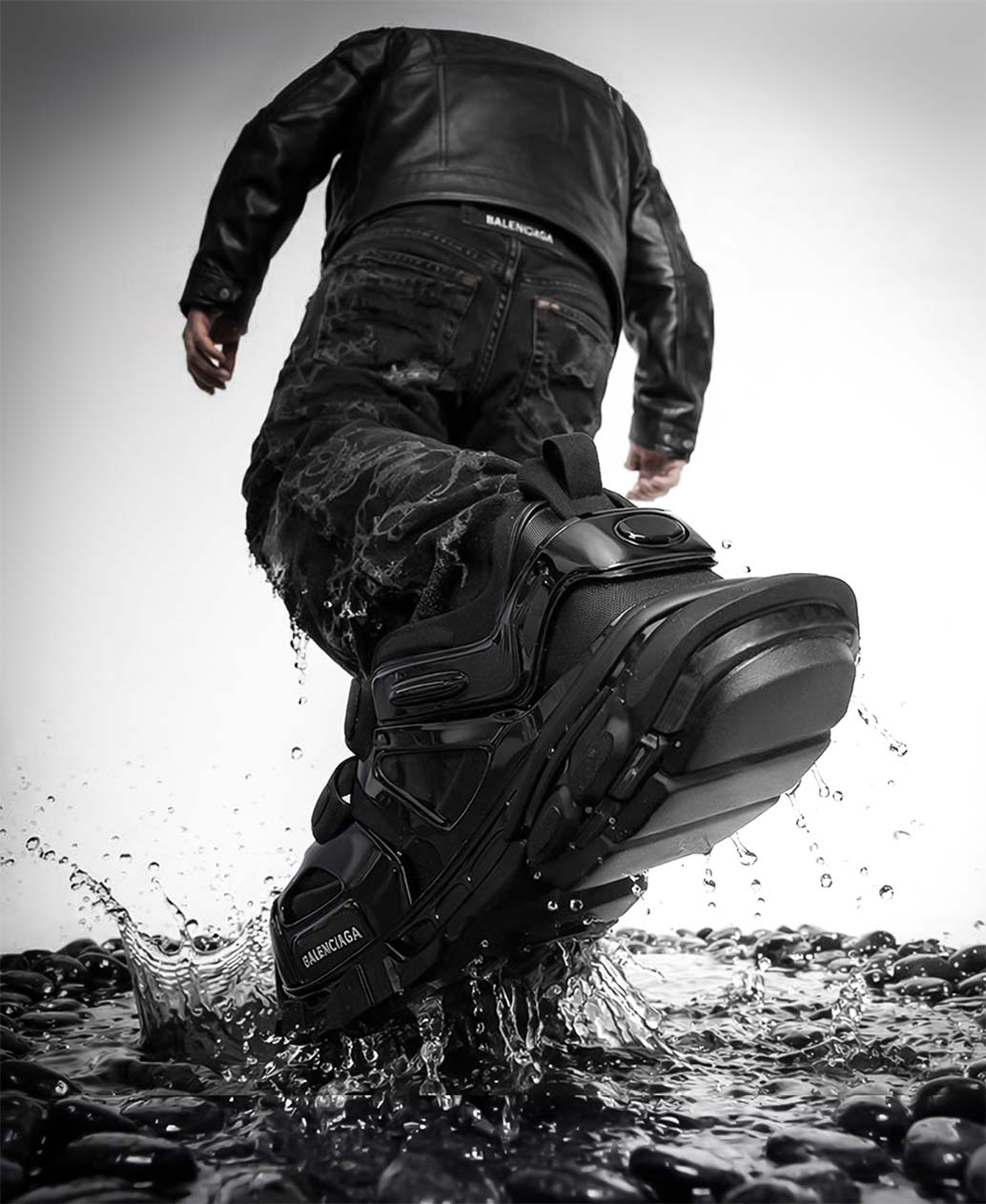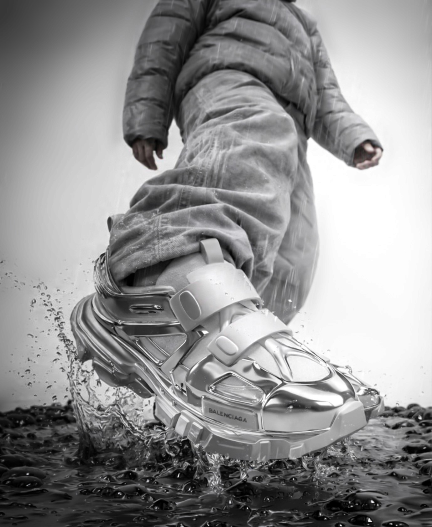 This fictional project explores the design of a Balenciaga sneaker conceived as an urban protective object. The concept reinterprets the trail shoe through a brutal, industrial aesthetic inspired by volcanic materials and streetwear culture.